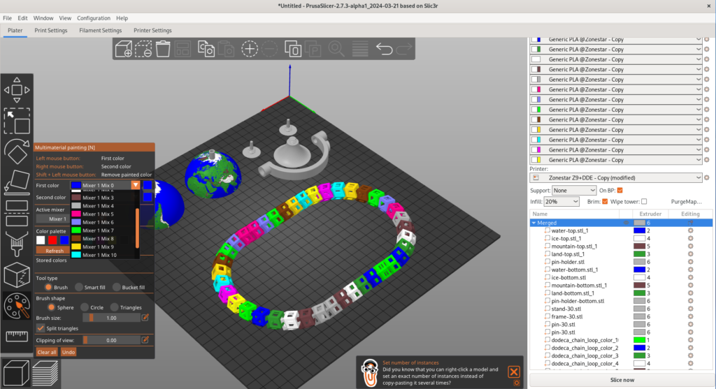 Iris also supports any 3D printer; ones using mixing hotends, multi-extruders, IDEX printers, toolchangers and the ‘manual’ tool changers.